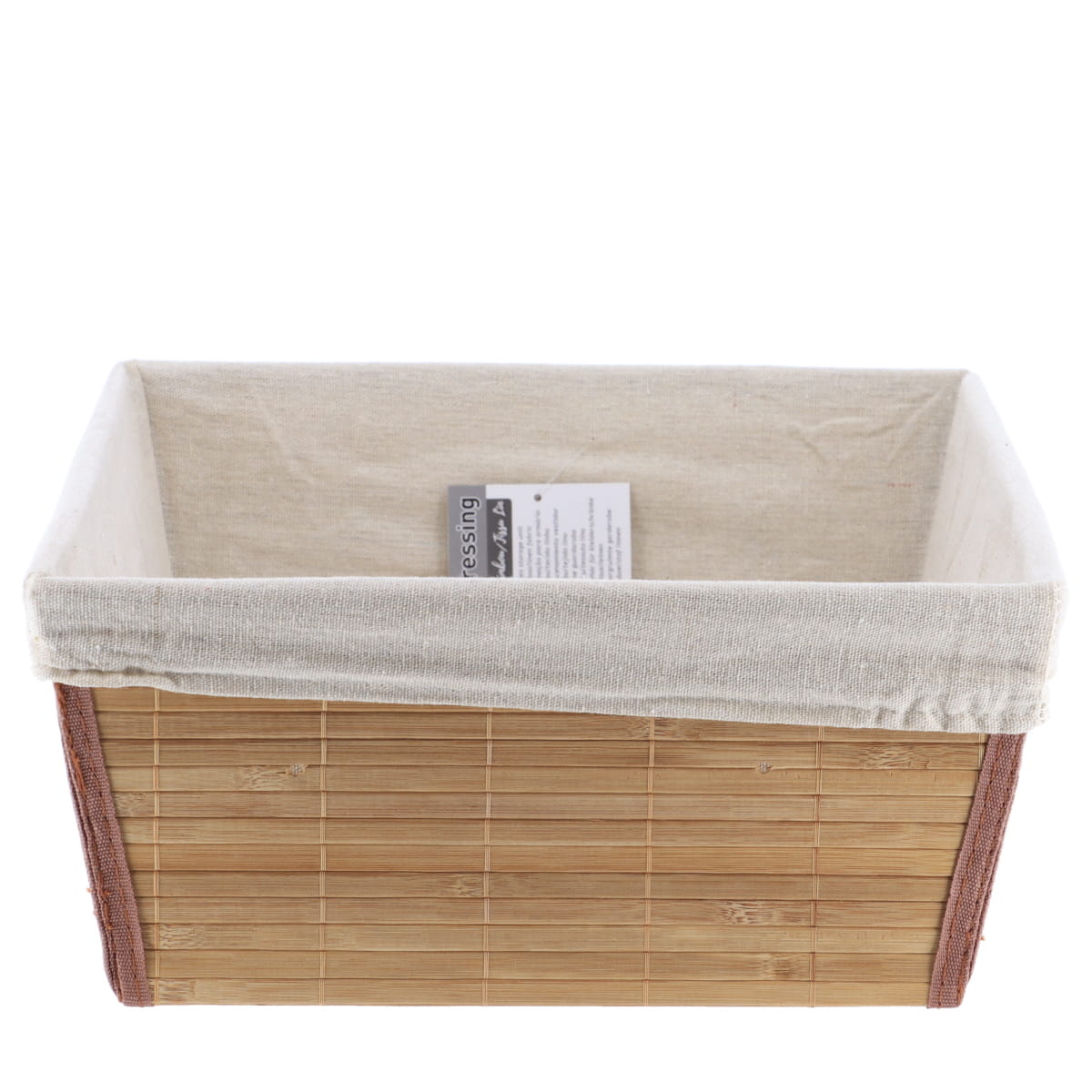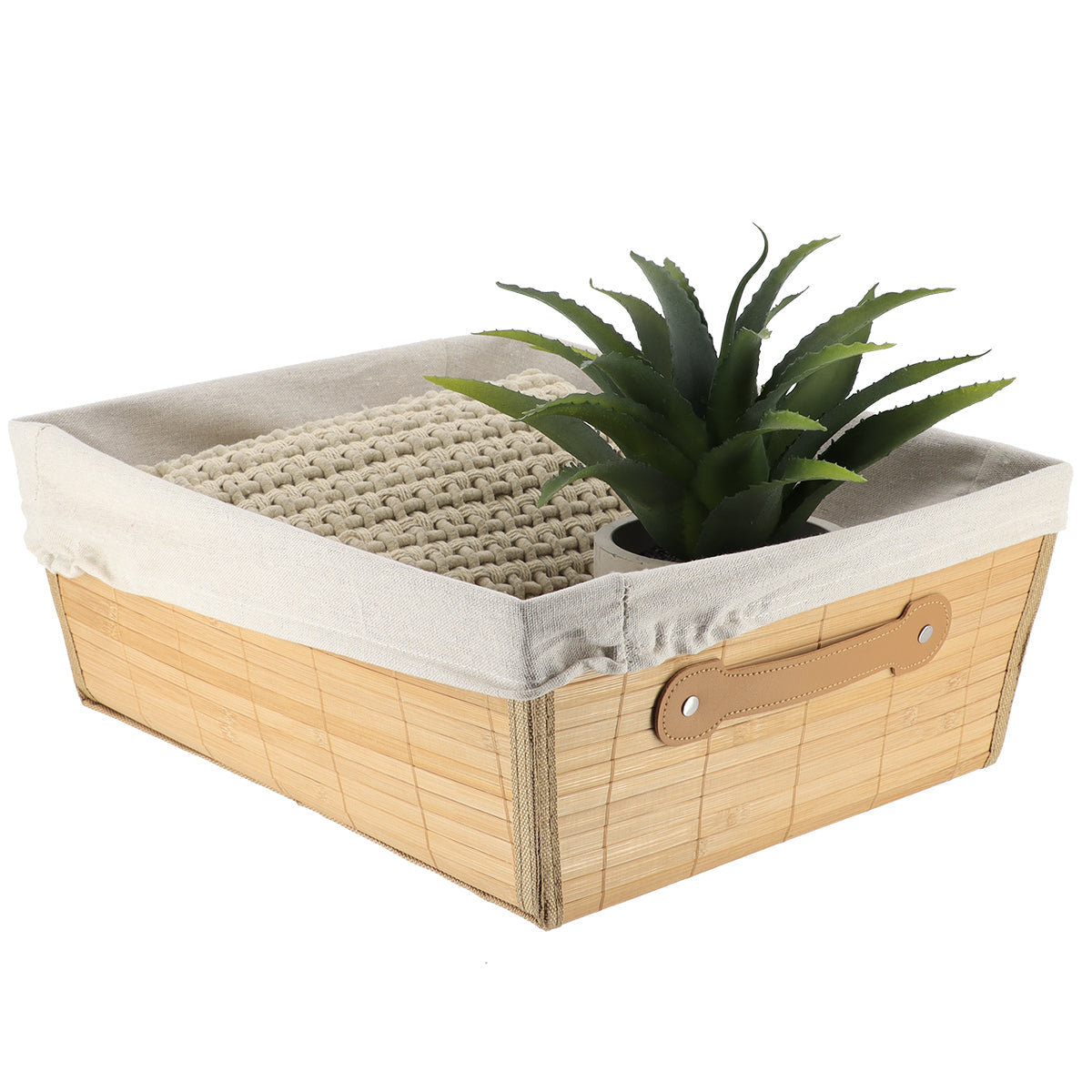 Coș realizat din trestii naturale de bambus. Ideal pentru depozitare și pentru a crea spații calde și primitoare. Este prevăzut cu o husă protectoare detașabilă din material textil, care oferă un aspect mai delicat produsului. Se integrează perfect în sertare și pe rafturi.