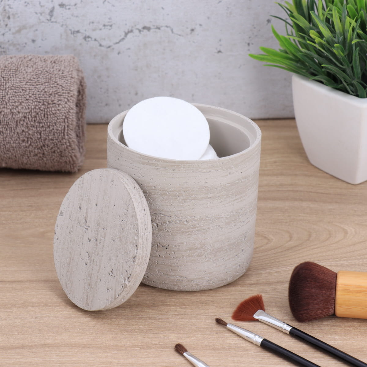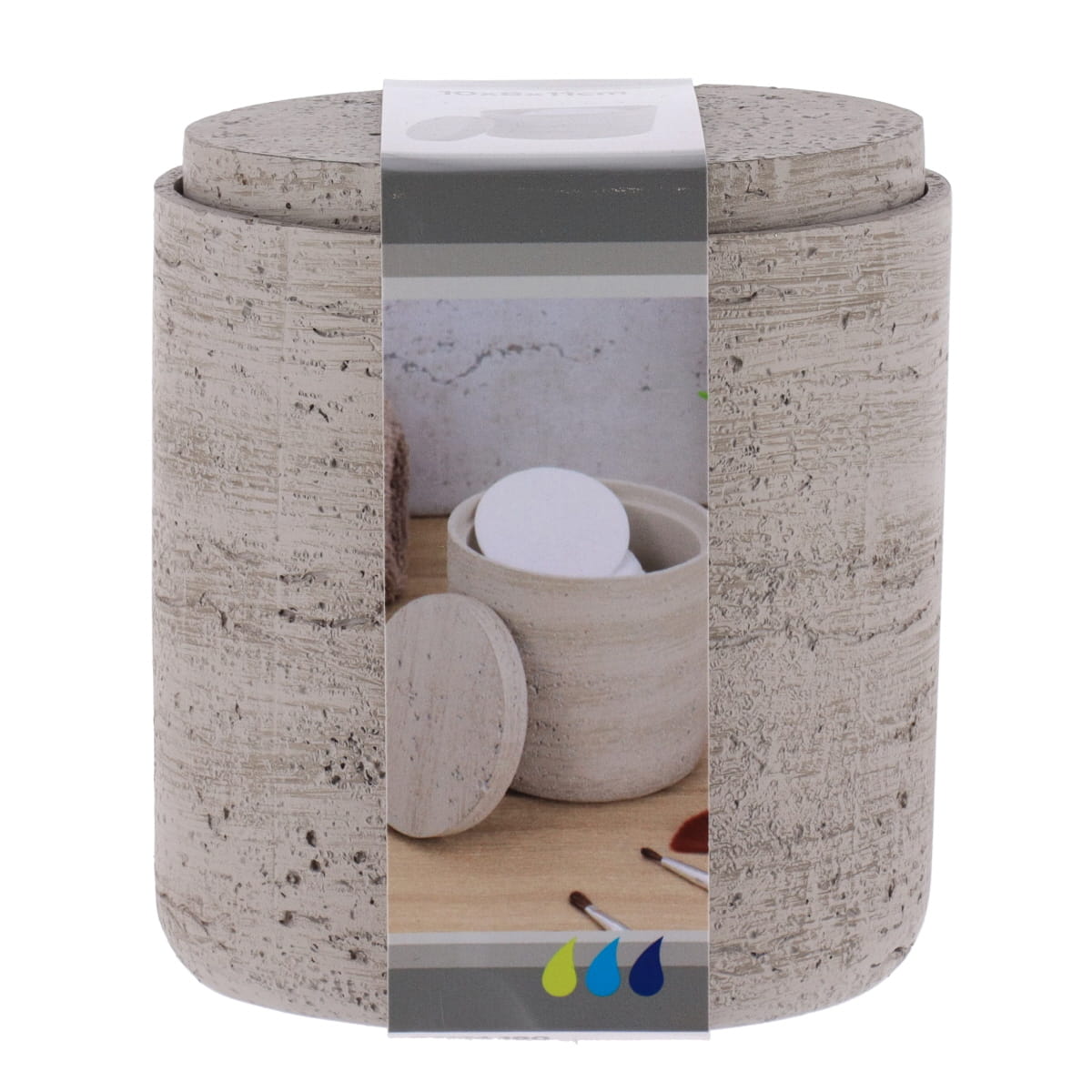 Adaugă un plus de modernism și eleganță băii tale cu această cutie din polirășină cu finisaj efect beton. Robustă și rafinată, oferă o alternativă chic la accesoriile tradiționale, aducând o textură minerală naturală. Forma ovală este ideală pentru depozitarea dischetelor demachiante, iar capacul protejează conținutul de praf.