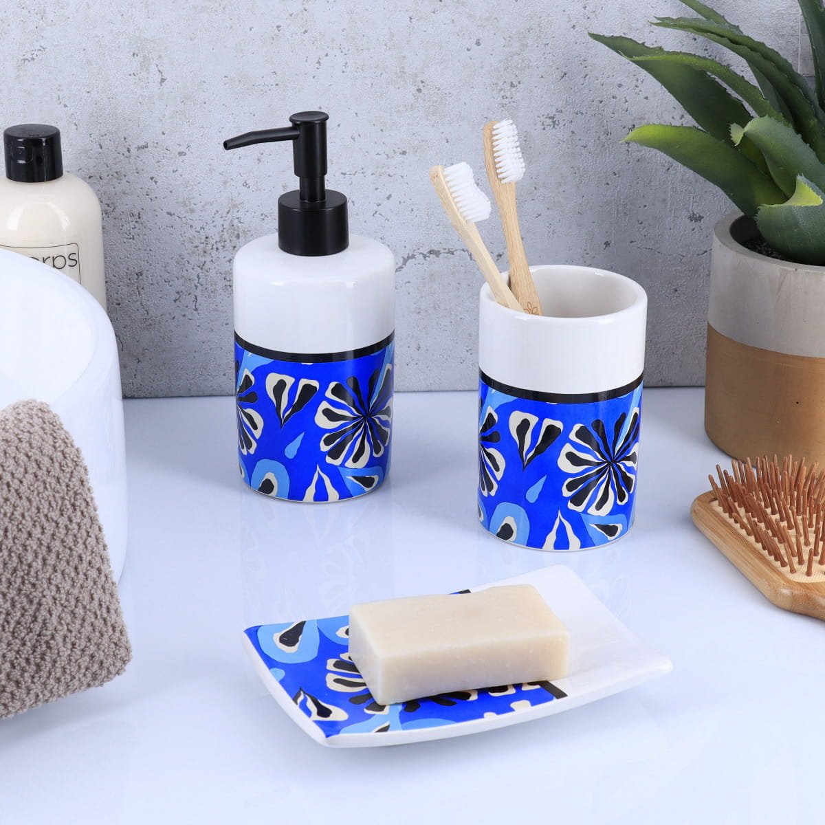 Dispenser pentru săpun lichid realizat din dolomită imprimată, cu pompiță neagră din plastic și design vibrant, parte din colecția „Signature”. Nuanța intensă de albastru majorelle, inspirată din grădinile Majorelle din Marrakech, aduce un plus de eleganță și modernitate băii tale. Un design îndrăzneț, cu efect calmant și energizant, ideal pentru începutul zilei sau momentele de relaxare. Certificat TRIMAN, ușor de întreținut. Produs fragil.