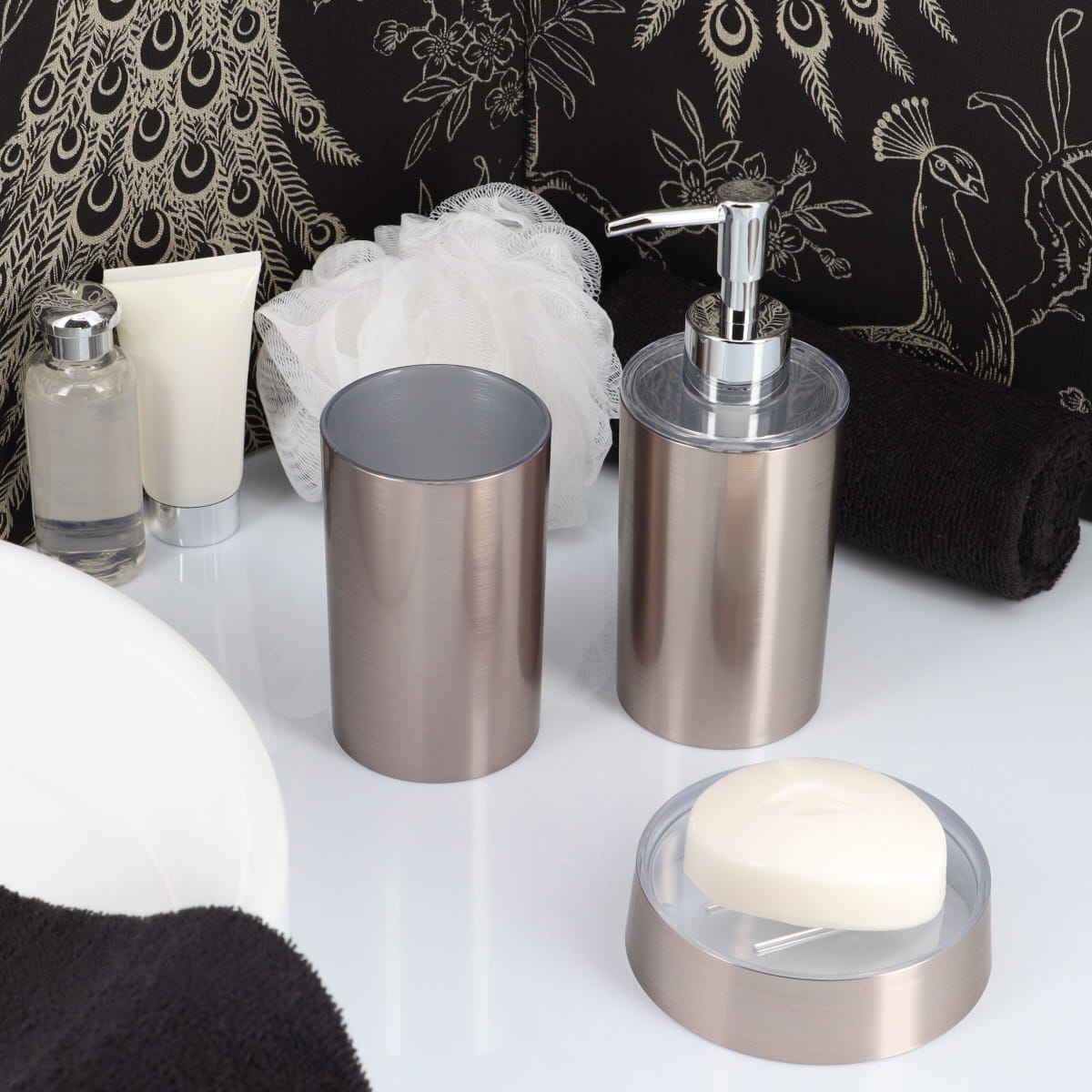 Dispenserul PS – METALLIZED EFFECT este realizat din plastic transparent tratat cu efect metalizat argintiu, cu pompă din metal cromat. Designul său industrial adaugă un accent decorativ elegant în baie. Este ușor, robust și ideal pentru săpun lichid, integrându-se perfect în colecțiile cu finisaje metalice.