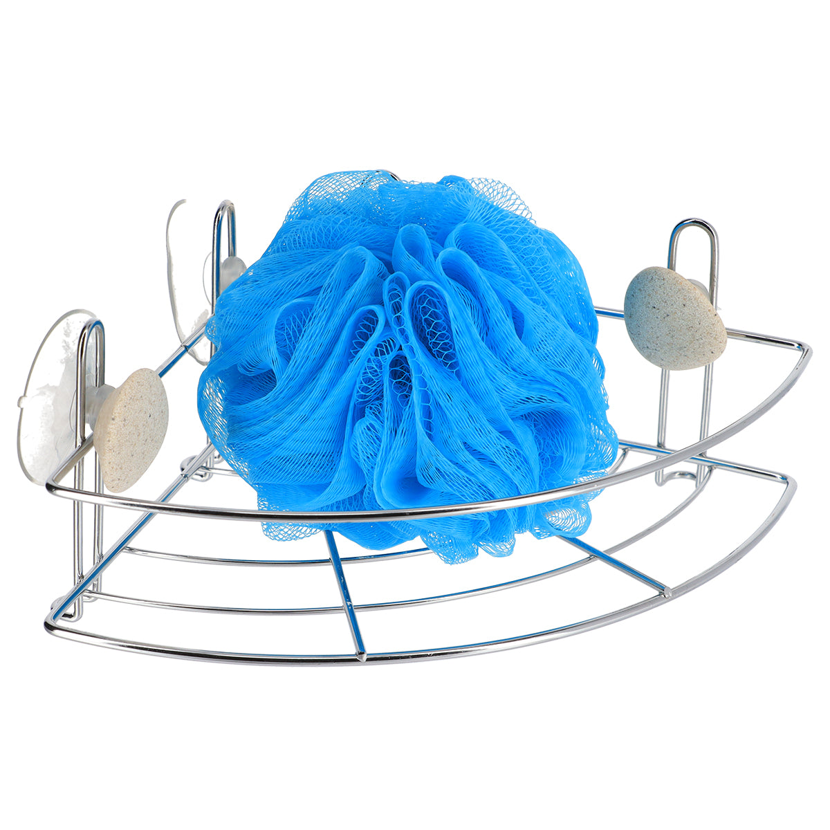 Această etajeră de colț din metal este prevăzută cu 4 ventuze și 2 decorațiuni elegante în formă de pietricele, oferind o soluție practică și estetică pentru depozitarea gelurilor de duș și a șampoanelor. Se fixează fără găurire, fiind ideală pentru colțurile băii. Finisajul argintiu tip oglindă adaugă un plus de rafinament și luminozitate.