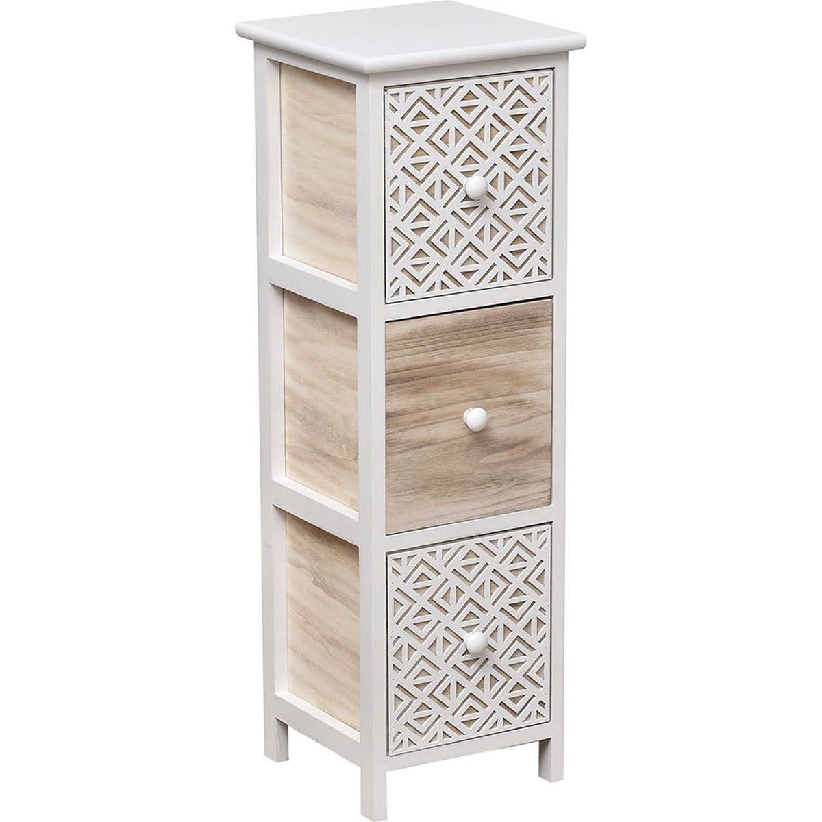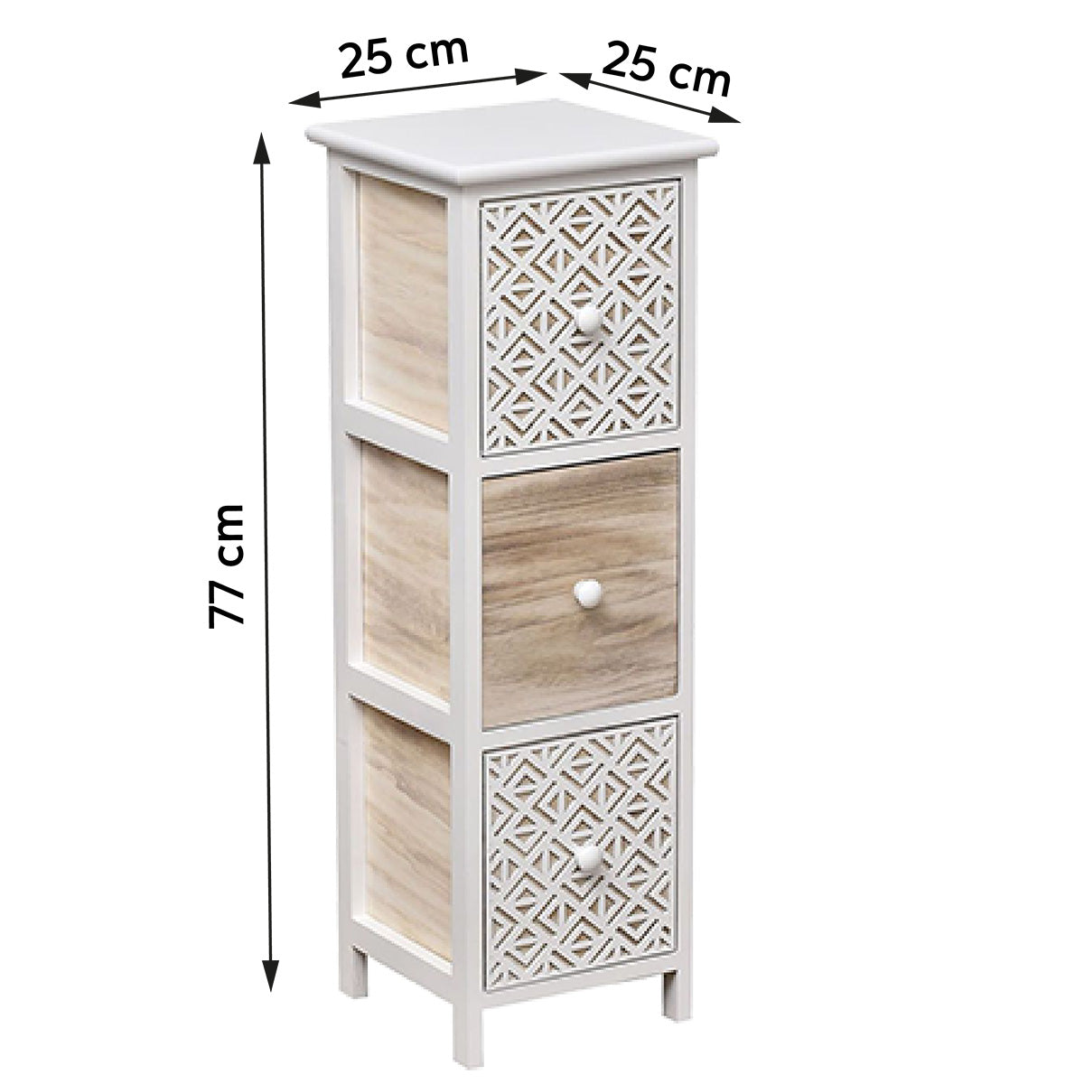 Unitate de depozitare cu 3 sertare. Structură din lemn de Paulownia și panou din fibră de densitate medie (lemn), cu mânere rotunde. Model asamblat, culoare alb/natural cu gravură, dimensiuni: L 25 cm x A 25 cm x Î 77 cm. Ideală pentru baie (rezistentă la umiditate).