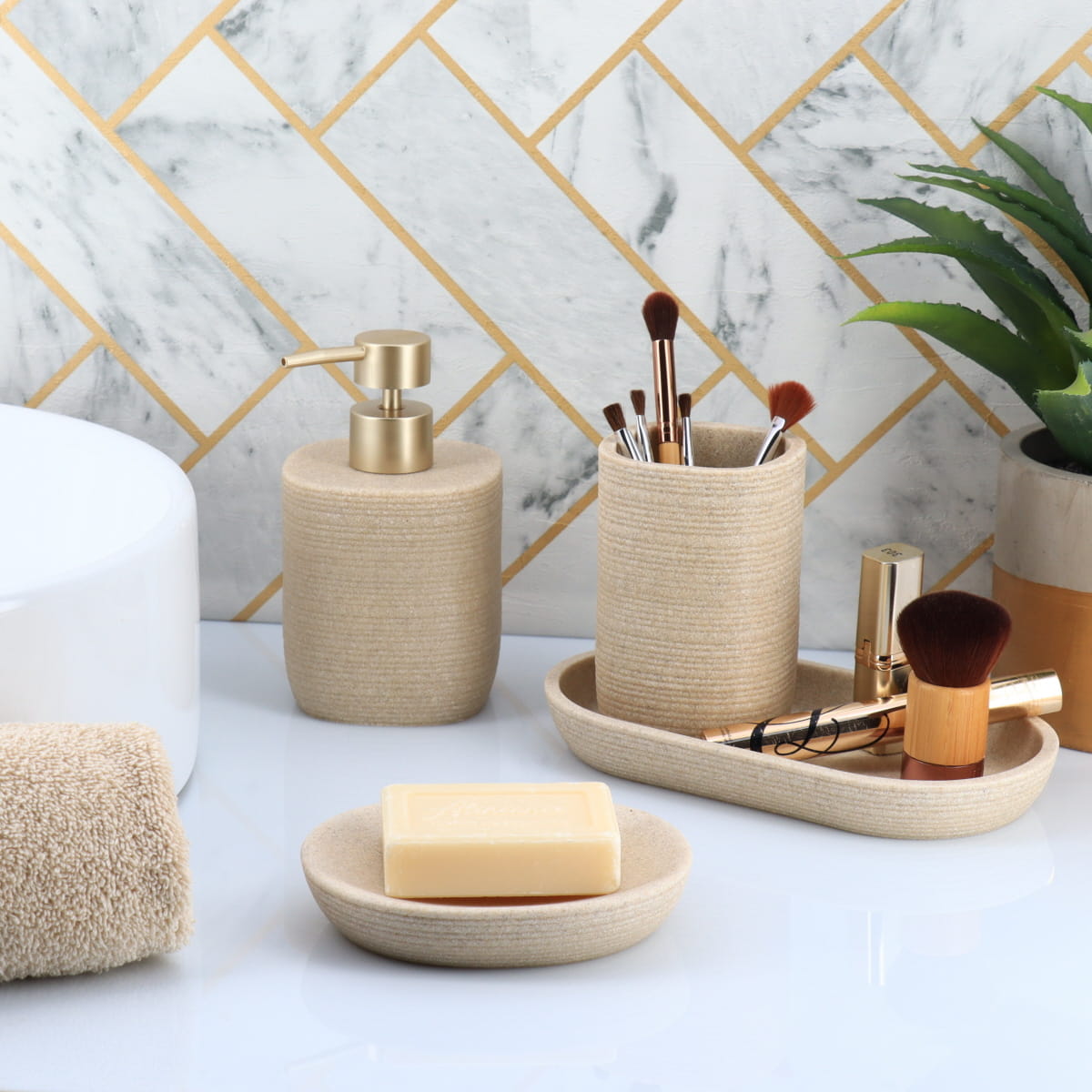 Adaugă o notă de rafinament și naturalețe băii tale cu paharul din rășină cu dungi fine, în nuanțe calde de bej și crem natural. Acest accesoriu elegant din colecția LINA este ideal pentru păstrarea periutelor și pastelor de dinți, completând perfect decorul băii prin aspectul său rafinat și textura mată, inspirată de piatra naturală.