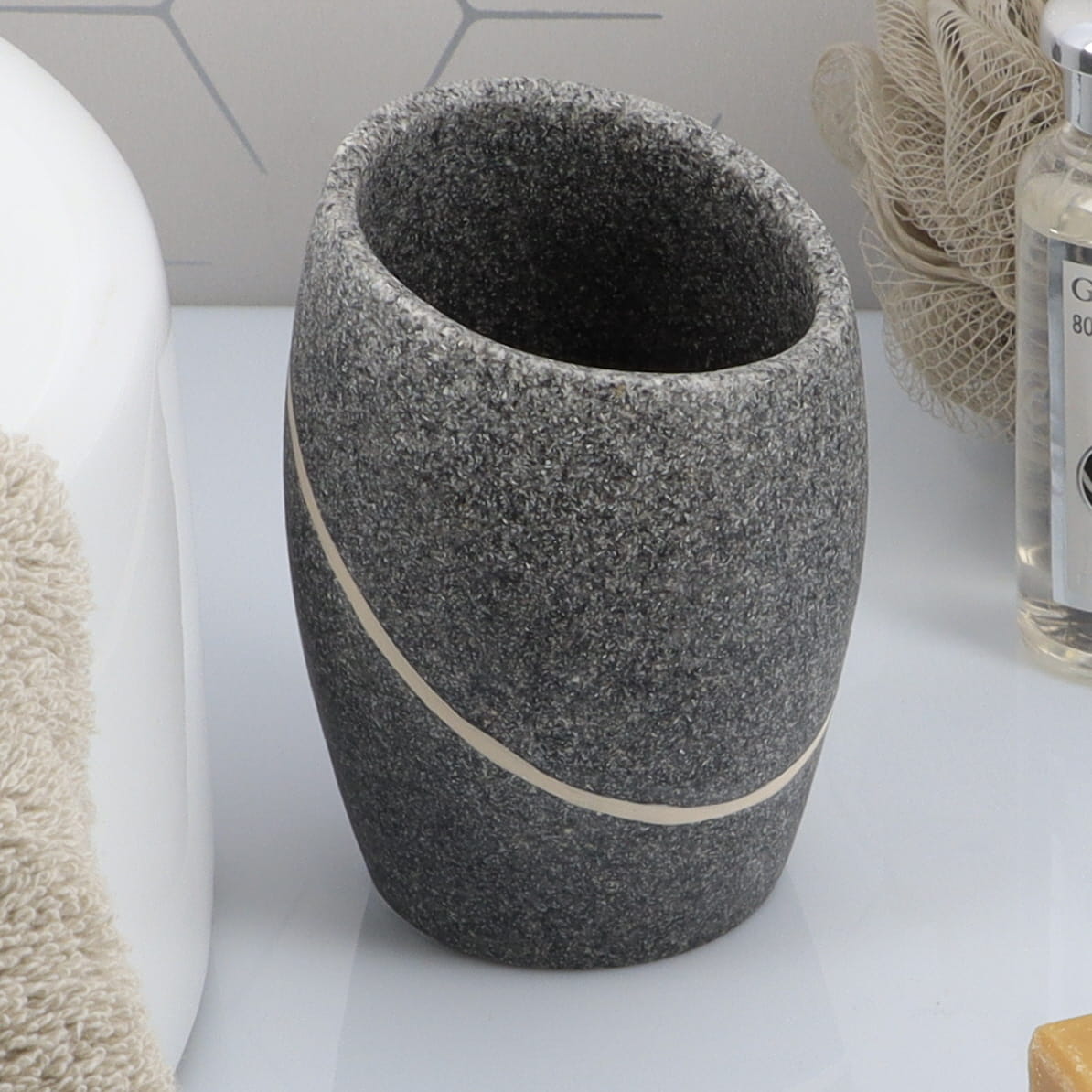 Acest pahar de baie din polirășină ultra-rezistentă este ideal pentru utilizare zilnică în medii umede. Designul său rotund, cu finisaj mineral și tonuri gri, oferă un aspect brut, discret și contemporan. Perfect pentru depozitarea periuțelor de dinți și a pastei, este potrivit pentru băi moderne cu accente naturale.
