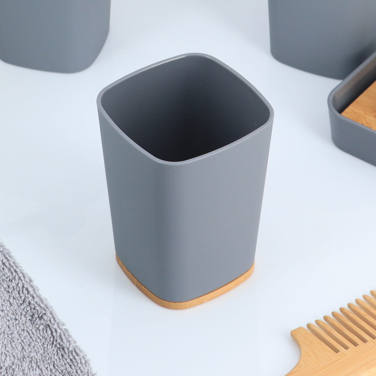 Paharul RUBBER + ABS AND BAMBOO – GREY combină materiale naturale și sintetice pentru a oferi un design exotic, rafinat și funcțional. Textura sa moale la atingere și finisajul mat îl fac ideal pentru băile moderne, adăugând un accent neutru și elegant. Este ușor, rigid și rezistent – perfect pentru periuțe și pastă de dinți.