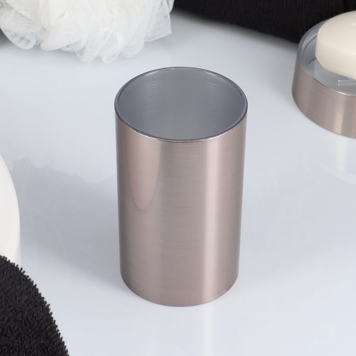 Paharul PS – METALLIZED EFFECT este realizat din plastic transparent tratat cu efect metalizat argintiu, ideal pentru periuțe și pastă de dinți. Designul său industrial adaugă un accent decorativ elegant în baie. Este ușor, robust și se potrivește perfect în colecțiile cu finisaje metalice.