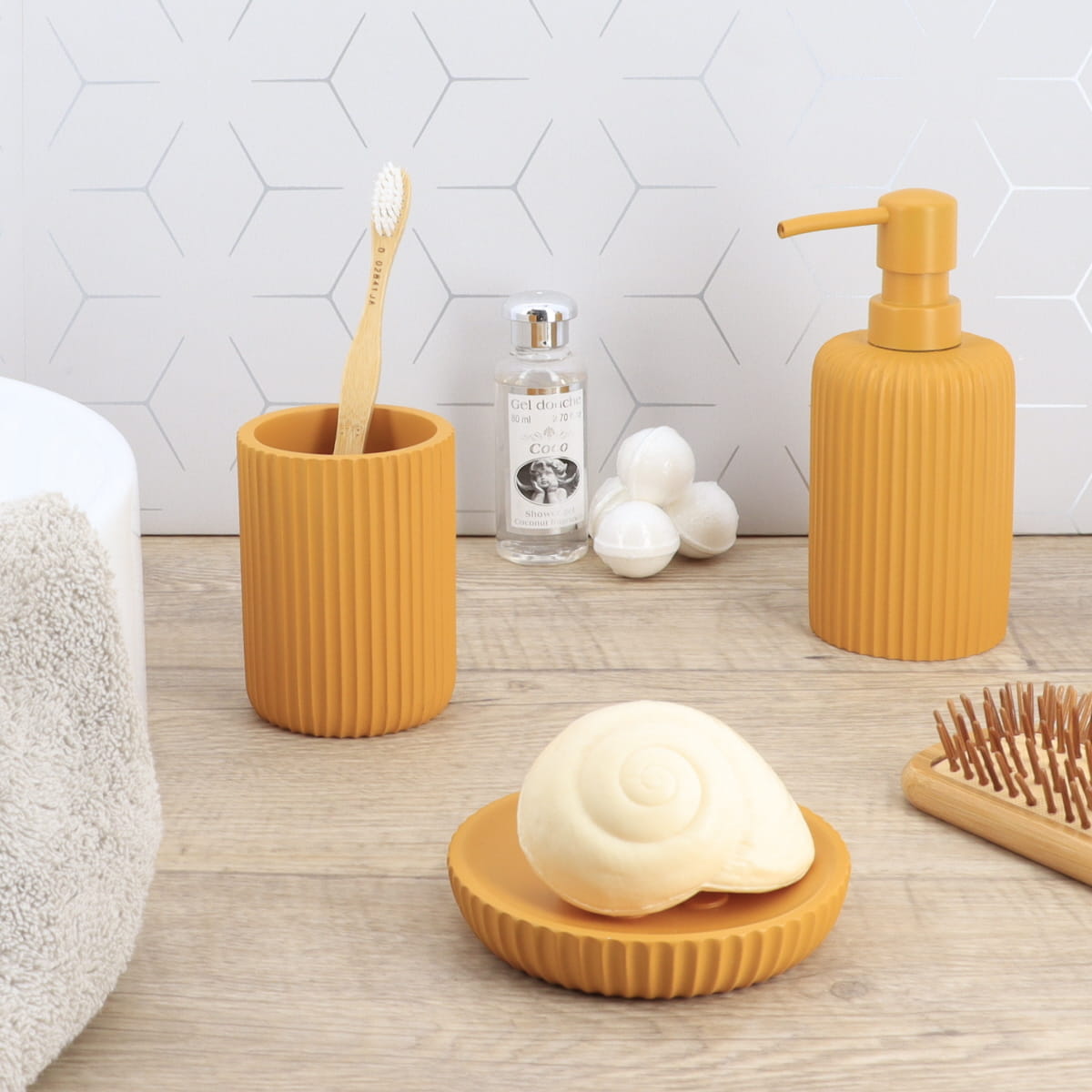 Acest pahar din polirășină cu finisaj striat are un design fermecător, ideal pentru orice tip de interior. Este foarte robust și ușor de curățat, perfect pentru depozitarea periuțelor și pastei de dinți. Culoarea muștar adaugă un accent cald și vibrant, ideal pentru băi cu personalitate.