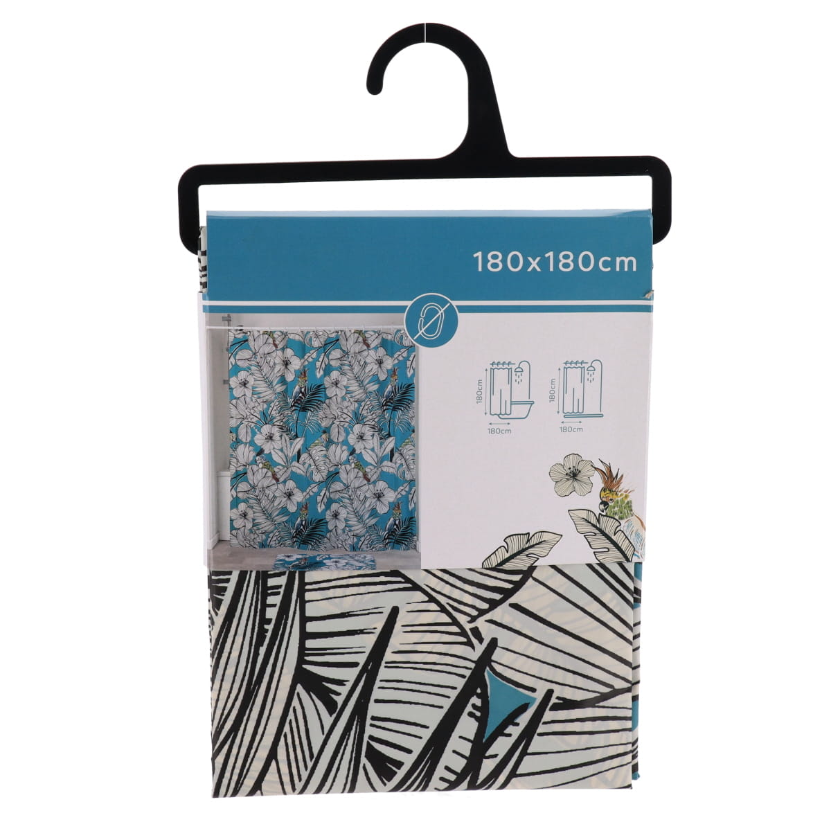 Perdea de duș din colecția „Jungle Fever”, imprimată cu frunziș tropical și papagali pe fundal albastru, ideală pentru a crea o atmosferă luxuriantă și captivantă în baie. Fabricată din PEVA, material impermeabil și flexibil, fără PVC, ușor de întreținut. Prevăzută cu spații pentru inele de agățare (neincluse). Certificată TRIMAN pentru conformitate ecologică.