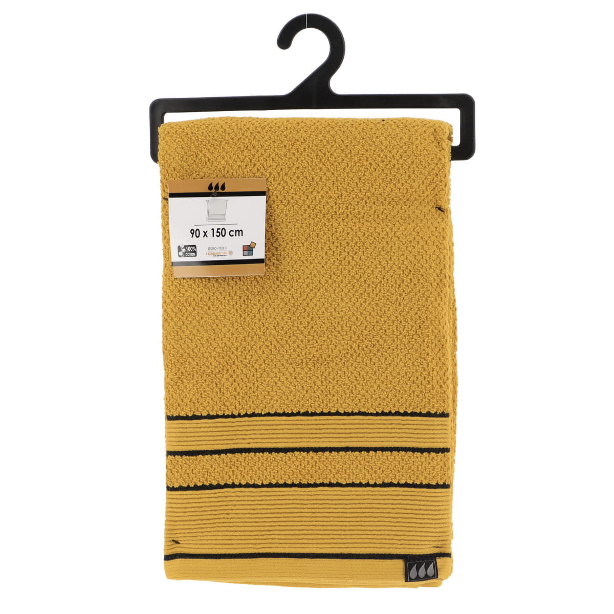 Prosop de baie extra mare din bumbac 100%, parte din gama „Black Line”. Cu o densitate de 500 g/m², este moale, absorbant și ideal pentru confortul zilnic. Dimensiunea generoasă de 90×150 cm oferă acoperire optimă după baie, iar culoarea ocru cu accente negre adaugă un plus de căldură și rafinament băii tale. Produs certificat OEKO-TEX®, garantând absența substanțelor toxice în textile.