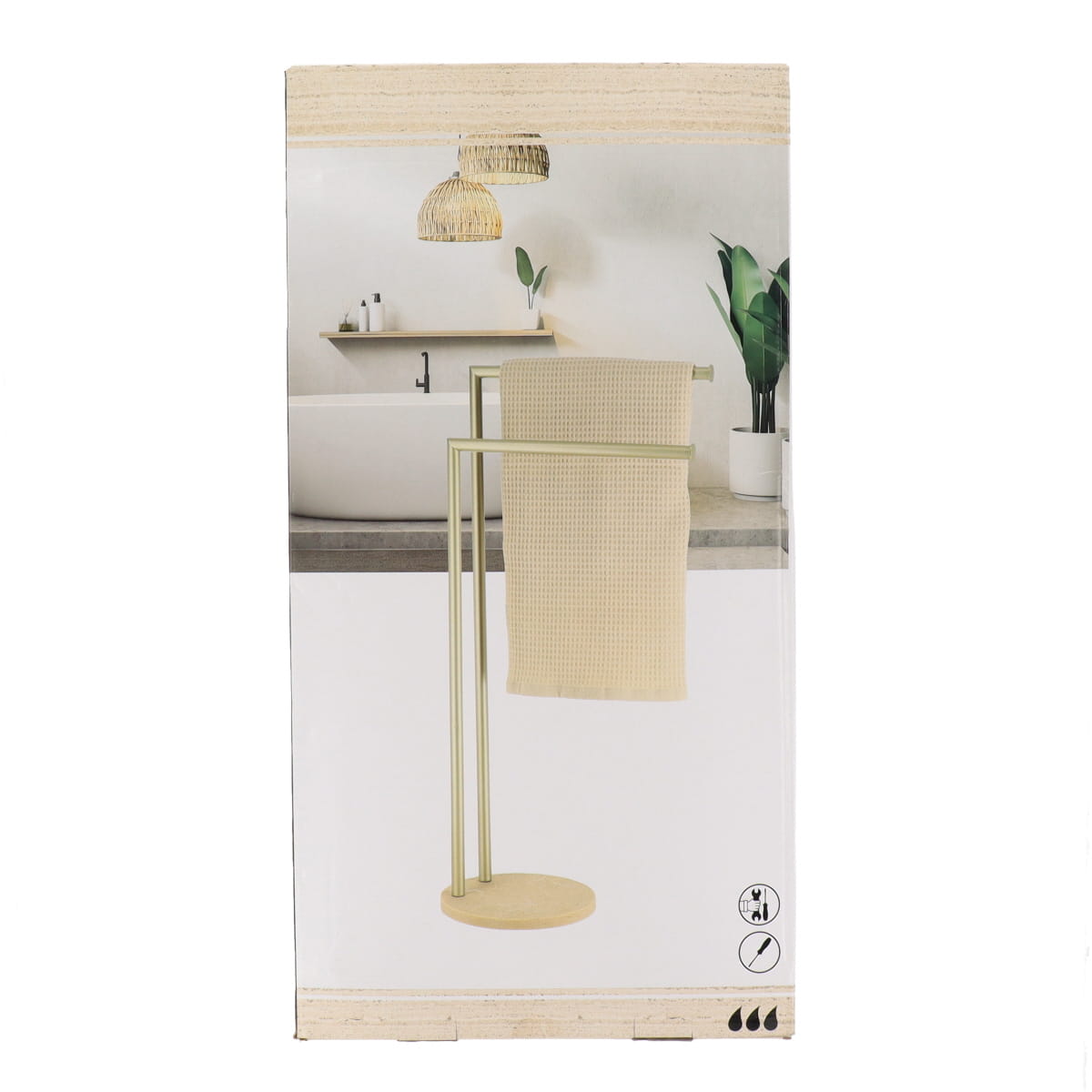 Suportul de prosoape din metal și polirasină aduce un echilibru perfect între designul natural al pietrei travertin și eleganța detaliilor metalice. Cu două bare stabile și funcționale, este ideal pentru organizarea prosoapelor în baie, oferind un aspect ordonat și rafinat.