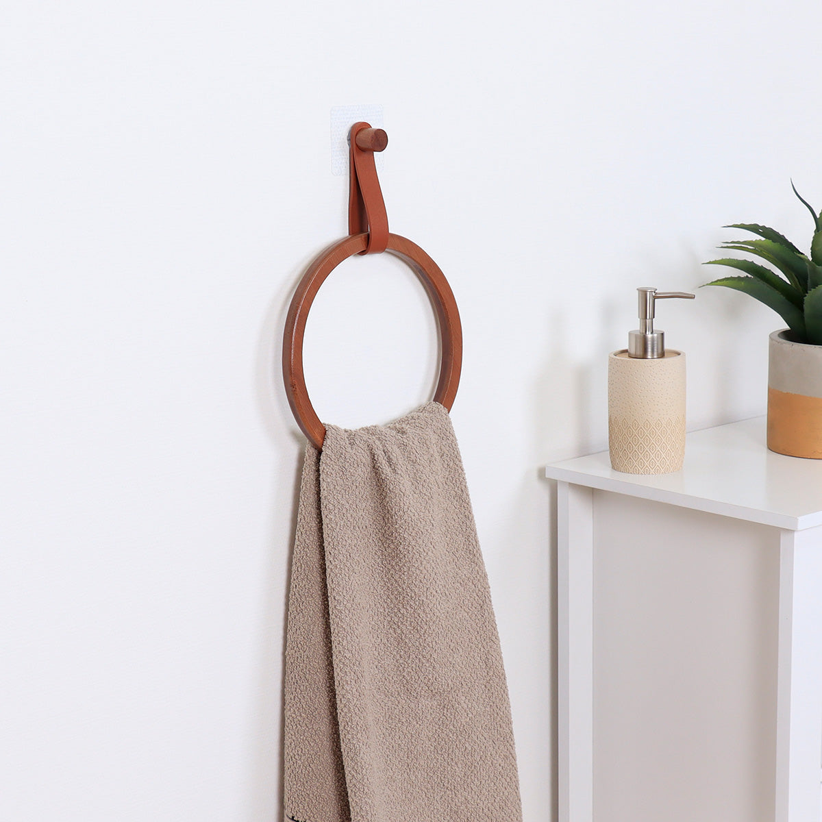 Suport prosop rotund din bambus + curea imitație piele pe sticker – AMBER